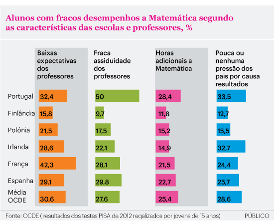 Em Portugal, a fórmula repete-se, com a retenção a ser o principal fator de risco. Aos 15 anos, 56,1% dos alunos com piores desempenhos a Matemática nos testes PISA (Programme for International Student Assessment) realizados em 2012 já tinha chumbado pelo menos uma vez. A média na OCDE é de 54,4%. Nos 64 países analisados, Portugal está entre os dez com maior percentagem de estudantes que reportaram já ter reprovado pelo menos um ano: 34,3%, o que quase triplica a média da OCDE.