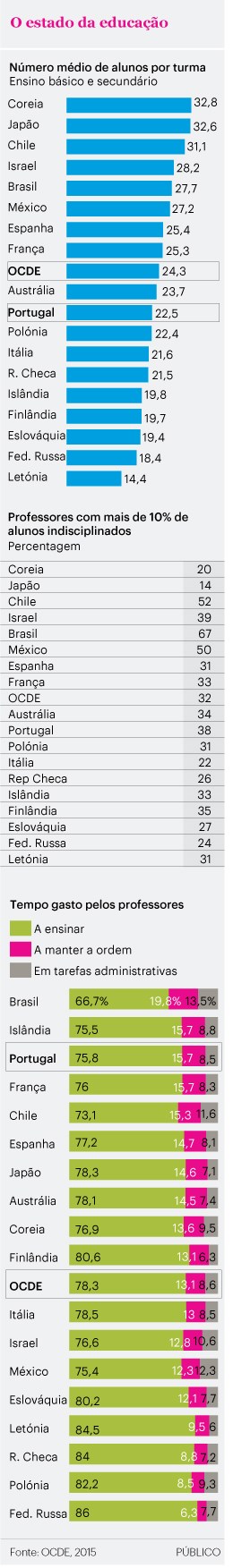 Para avaliar a relação entre a dimensão média das turmas e o tempo gasto em actividades de ensino e a manter a ordem na sala de aula, o CNE recuperou os dados do último inquérito realizado pela OCDE a professores e dirigentes escolares de 34 países, datado de 2013. As respostas recolhidas no âmbito do inquérito Teaching and Learning International Survey (TALIS) dão conta de que Portugal está entre os países em que os professores dizem gastar mais tempo a manter a ordem na sala de aula: 15,7% do tempo de aulas é consumido nesta tarefa, contra uma média de 13,1% na OCDE. A Rússia é o país que apresenta melhores resultados neste capítulo, com apenas 6,3% do tempo dos professores a ser gasto em manter a ordem nas aulas. O pior é o Brasil, onde esta percentagem sobe para 19,8%.