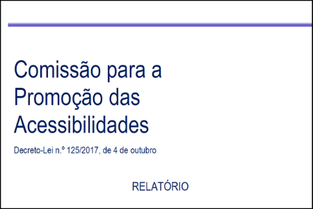O Relatório da Comissão para a Promoção das Acessibilidades, previsto no Decreto-Lei n.º 125/2017, de 04 de outubro, cuja entidade criada pelo Despacho n.º 8614/2018, de 27 de agosto, do Ministro do Trabalho, Solidariedade e Segurança Social, já se encontra disponível no sítio web do Instituto Nacional para a Reabilitação, I. P., o qual foi entregue no passado dia 30 de janeiro, pelos membros da Comissão, a Sua Excelência a Secretária de Estado da Inclusão das Pessoas com Deficiência, Ana Sofia Antunes.